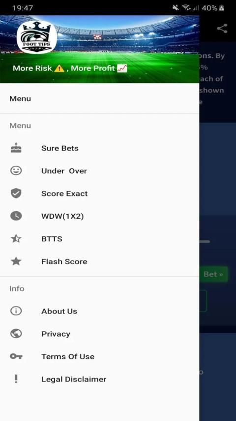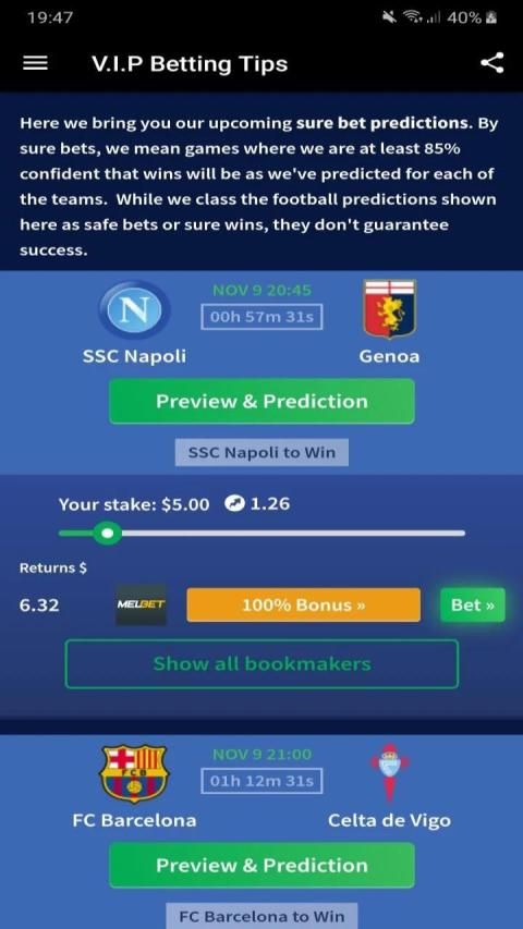 सट्टेबाजी की युक्तियों के लिए अब आपको फुटबॉल ज्ञान की आवश्यकता नहीं है। शर्त और हमारे app का उपयोग कर जीत! हम आपके लिए हर दिन 9 घंटे काम कर रहे हैं ताकि सर्वश्रेष्ठ सट्टेबाजी के टिप्स मिल सकें।