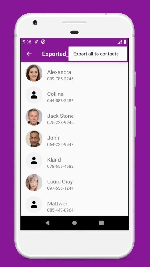 Many of us have old backups from previous phones in vcf file format, now it's not a problem. Just open the program, navigate to file, and on the contacts list screen export all of the contacts to the phone memory or Google account.