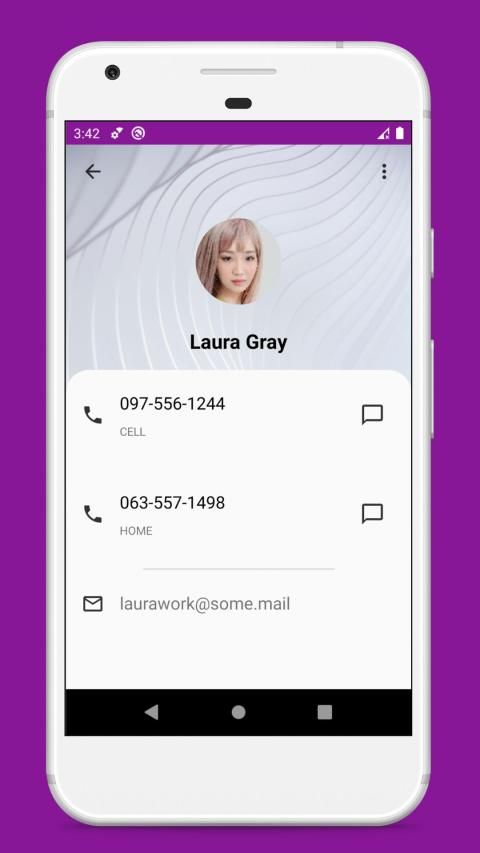 न्यूनतम और सहज वीसीएफ संपर्क स्क्रीन: फोटो, नाम, फोन, ई-मेल, वेब-पता, पते, और नोट। फ़ील्ड डेटा को बफर में कॉपी करने के लिए एक लंबा टैप करें या "स्क्रीन का उपयोग करके खोलें" लॉन्च करने के लिए उस पर टैप करें।