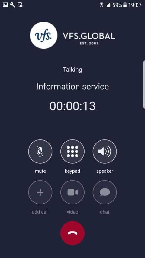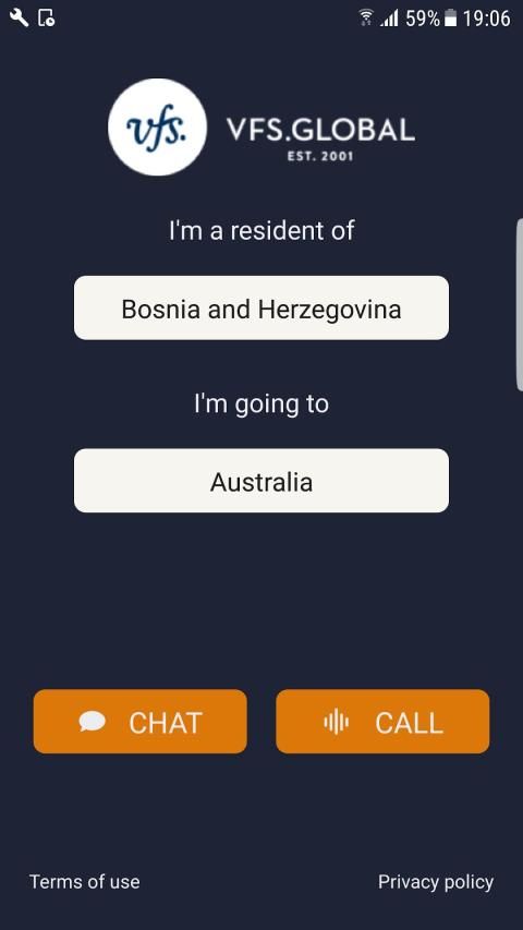 Select resident country, select visiting country and call or chat to VFS Global Center via Internet connection for free.