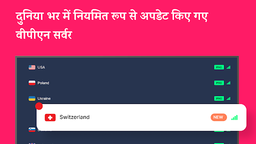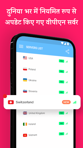 सर्वरों की सबसे बड़ी संख्या भारत में है, लेकिन ऐप में जर्मनी, फ्रांस, इंग्लैंड, नीदरलैंड, सिंगापुर जैसे दुनिया भर के सभी प्रमुख स्थानों में सर्वर भी हैं. PRO संस्करण में सभी प्रमुख देश और अधिक विदेशी स्थान जैसे मलेशिया, तुर्की, दक्षिण अफ्रीका, ब्राजील, स्पेन और कई अन्य शामिल हैं.