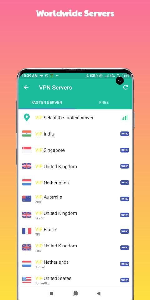 टर्बो ऐप का उपयोग करके वीपीएन नेटवर्क से कनेक्ट करना सरल ऐप नियंत्रण के साथ बेहद आसान है। केवल एक टैप से, आप कई देशों के वीपीएन सर्वर से जुड़ सकते हैं और असीमित समय के लिए वीपीएन से जुड़े रह सकते हैं। तो आप किसका इंतज़ार कर रहे हैं? अब Android के लिए सबसे अच्छा मुफ्त वीपीएन ऐप डाउनलोड करें।