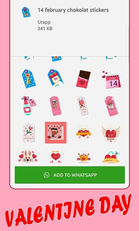 व्हाट्सएप (WAStickerapp) के लिए वेलेंटाइन डे स्टिकर कई श्रेणियों के साथ स्टिकर का एक बड़ा पैक प्रदान करता है जैसे लव कपल स्टिकर, सेंट-वैलेंटाइन स्टिकर, रोमांटिक स्टिकर, टेक्स्ट स्टिकर, टेडी लव स्टिकर, लव उद्धरण, लड़कियों के लिए निक स्टिकर, सेंट-वैलेंटाइन संदेश , रेड हार्ट स्टिकर, लड़कों के लिए निक स्टिकर, लव स्टिकर का संग्रह, लव इमोजी, लव इमोटिकॉन्स और वेलेंटाइन कार्ड, लव स्टिकर का सबसे अच्छा संग्रह, लव इमोजी, रोज़ स्टिकर, सेंट-वैलेंटाइन इमोजी, टेडी और सेंट-वैलेंटाइन चॉकलेट स्टिकर भी।
