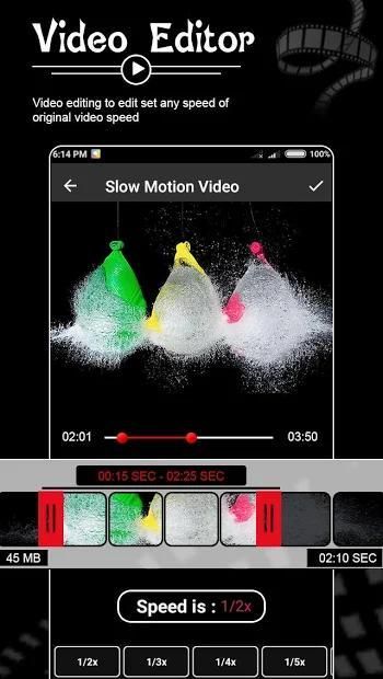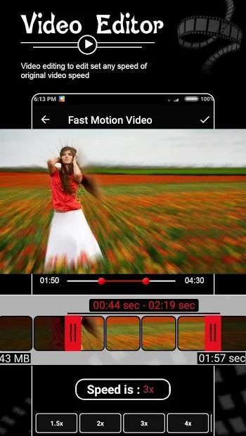Video इस वीडियो एडिटर ऐप का उपयोग करके वीडियो की गति बढ़ाने के लिए तेज़ गति वीडियो ऐप का उपयोग करें। आप ट्रिम विकल्प का उपयोग कर तेजी से गति या वीडियो के विशेष हिस्से में पूरा वीडियो चला सकते हैं। 1X, 2X, 3X, 10X तक की गति की तरह समर्थन करता है।