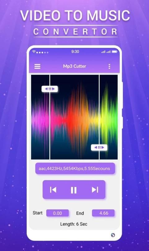 वीडियो चुनें और वीडियो का आरंभ और समाप्ति समय चुनें, जिसे आप ऑडियो में बदलना चाहते हैं, वीडियो टू म्यूजिक कन्वर्टर ऑडियो निकालें और अपने फोन में सेव करें। एमपी कन्वर्टर आपका म्यूजिक मेकर और ऑडियो मेकर टूल होगा।