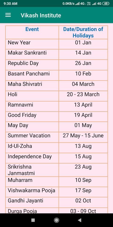 7. छुट्टियाँ: विकाश संस्थान से छुट्टियों की सूची।