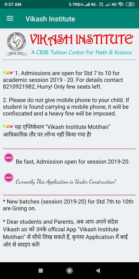 This application is specially designed for Students of Vikash Institute Motihari. Even you can fetch all the similar details from our official website.