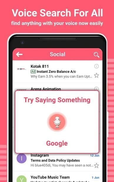 कभी-कभी हम ऐप या सामग्री के किसी भी नाम को लिखने के दौरान गलतियां करते हैं जिसे हम खोजना चाहते हैं। या कभी-कभी लोगों के पास खोज शब्द पर लिखने या लिखने के बिना कम शब्द शब्दावली या बहुत जल्दी है। यहां सभी समस्याओं के लिए सबसे अच्छा समाधान है, आपको केवल विशेष साइट या ऐप के साथ जाना और नाम से खोजना होगा। सभी फोन फ़ोल्डरों को टाइप करके और एक्सप्लोर करके चीजों को खोजने के लिए अपना समय बचाएं। वॉयस सर्च का इस्तेमाल फोन स्क्रीन पर चीजों और उपयोगी सामग्री को आवाज के साथ कहकर करें।