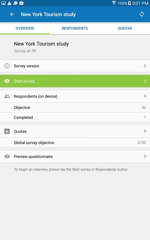 क्षेत्र में साक्षात्कारकर्ता उत्पादकता को अधिकतम करने के लिए बनाया गया है, एप्लिकेशन को मूल ऑनलाइन और ऑफलाइन काम करता है, स्वचालित रूप से एक केंद्रीकृत सर्वर के साथ डेटा सिंक्रनाइज़ जब एक नेटवर्क कनेक्शन उपलब्ध है।