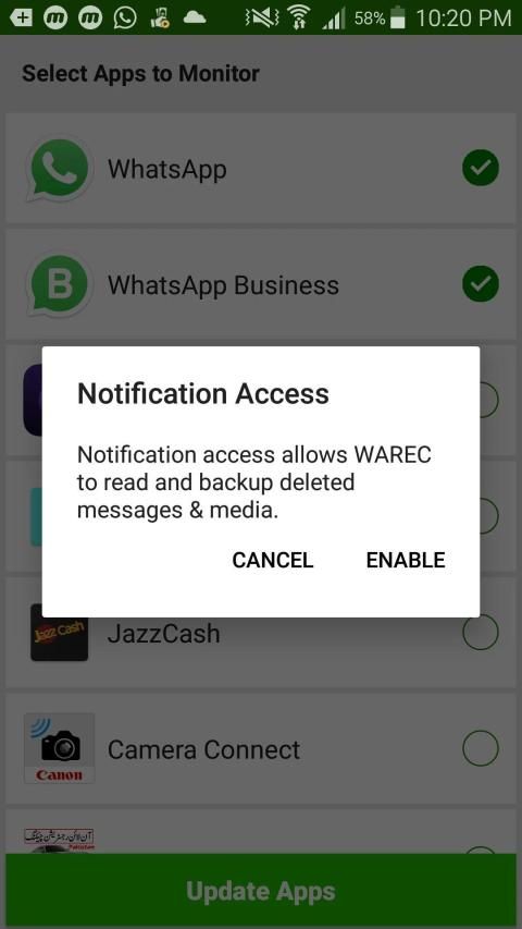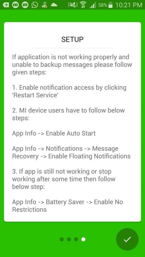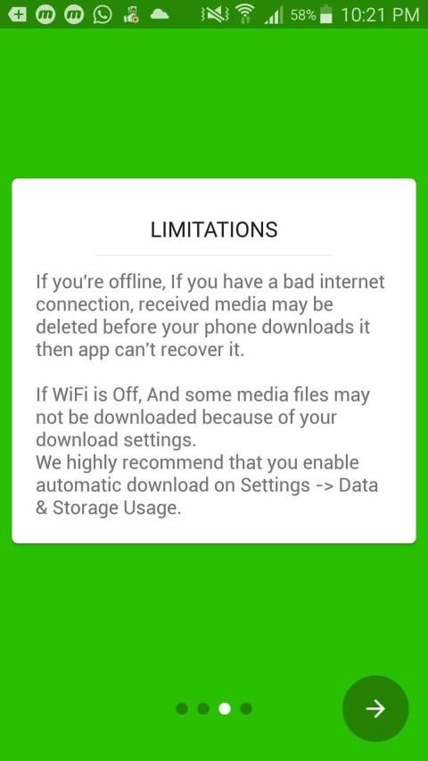 1) पाठ संदेश आपकी सूचनाओं द्वारा पुनर्प्राप्त किए जाते हैं, इसलिए, यदि आपने चुप्पी पर एक चैट डाल दी है, या यदि आप वर्तमान में मैसेजिंग ऐप पर एक संदेश देख रहे हैं, तो इसे हटाए जाने से पहले आपको एक अधिसूचना प्राप्त नहीं होगी ताकि WAREC इसे सहेज न सके! यह भी स्पष्ट रूप से इसका मतलब है कि आपके द्वारा इस ऐप को डाउनलोड करने से पहले सूचनाएं / संदेश पुनर्प्राप्त करना असंभव है (इसलिए इसे जल्दी से डाउनलोड करें!)।