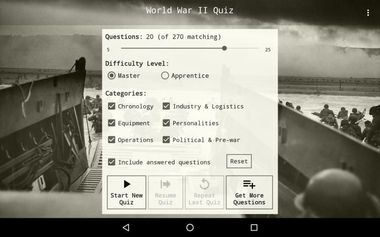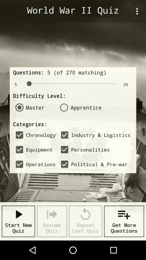 430 प्रश्नों (295 बहुत चुनौतीपूर्ण प्रश्नों और 135 आसान प्रश्नों में विभाजित) के साथ, यह प्रश्नोत्तरी वास्तव में द्वितीय विश्व युद्ध के आपके ज्ञान का परीक्षण करेगी! क्विज़ में युद्ध के सभी पहलुओं को शामिल किया गया है और दोनों मास्टर और प्रशिक्षु WW2 के इतिहास प्रेमियों को पूरा करता है।