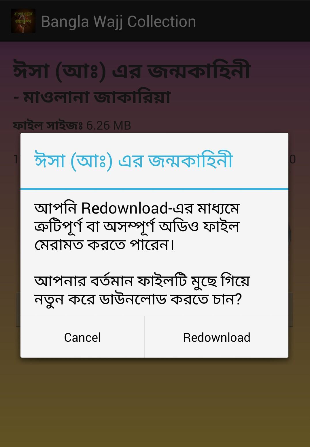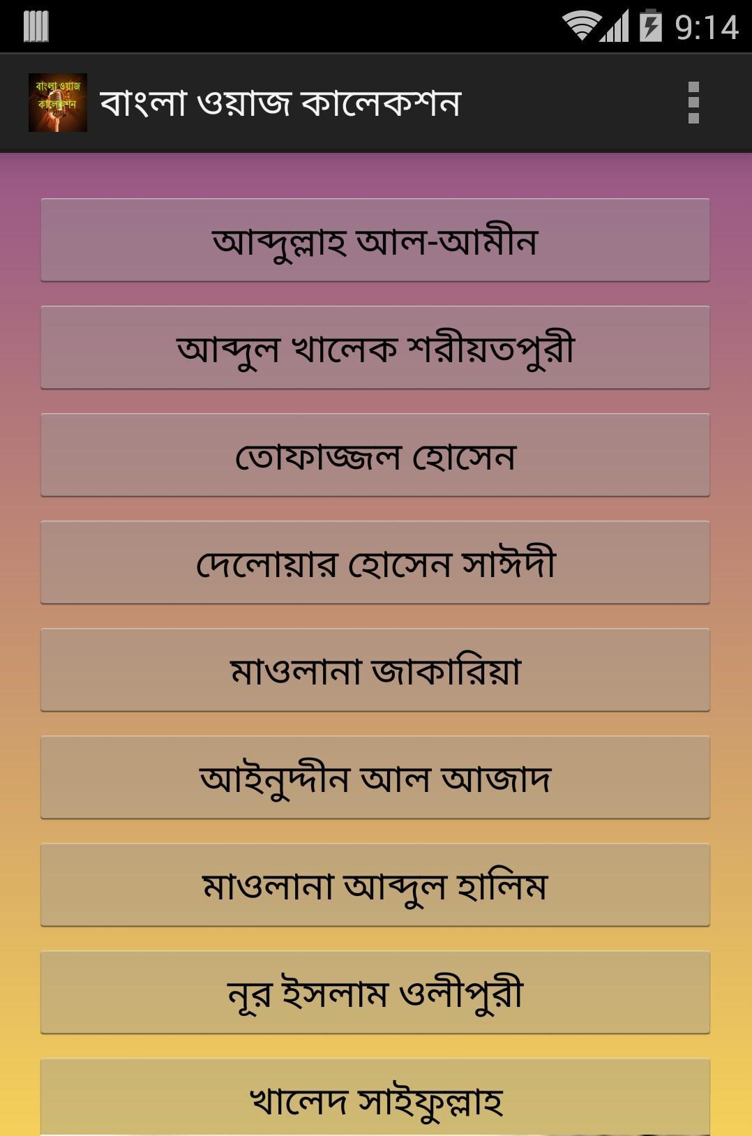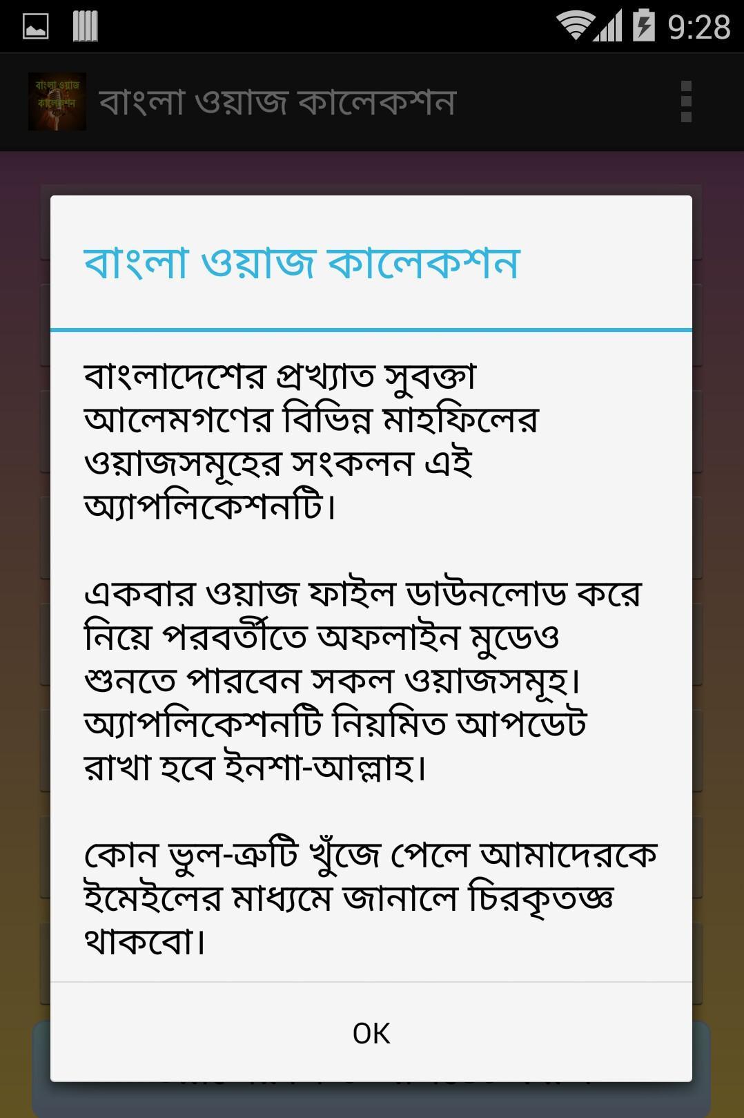 "বাংলা ওয়াজ কালেকশন" অ্যাপলিকেশনটি বিভিন্ন ইসলামী ওয়াজ মাহফিলে বাংলাদেশের স্বানামধন্য সুকণ্ঠী আলেম বক্তাগণের ওয়াজের একটি সংকলন।