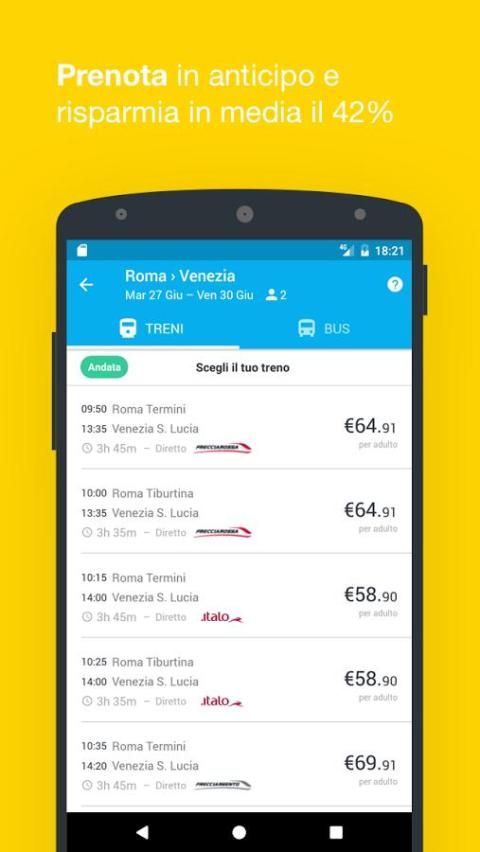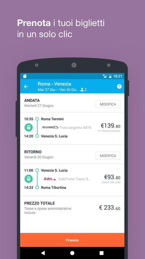 गाड़ियों, उड़ानों और बस इटली और यूरोप में के लिए टिकट आरक्षित करने के लिए आसान। एक ऐप्लिकेशन में आप महान सौदों Trenitalia, इटालो, Ryanair, Easyjet, Baltour और कई अन्य पा सकते हैं।