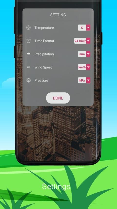 - Change unit setting: Temperature (C/F), Time format (12h/24h), Precipitation (mm, inch), wind speed (km/h, mi/h, m/s), pressure (mmhg, hPa, mbar)