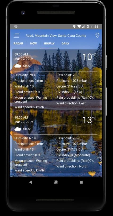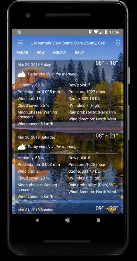 बाहर जाने से पहले, आप अप्रत्याशित मौसम परिवर्तनों की तैयारी के लिए इस मुफ्त मौसम ऐप की जांच कर सकते हैं। इसके अलावा, आप अपनी बाहरी गतिविधियों की योजना के लिए घंटों तक तापमान और बारिश की संभावना भी देख सकते हैं।