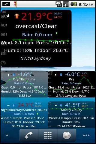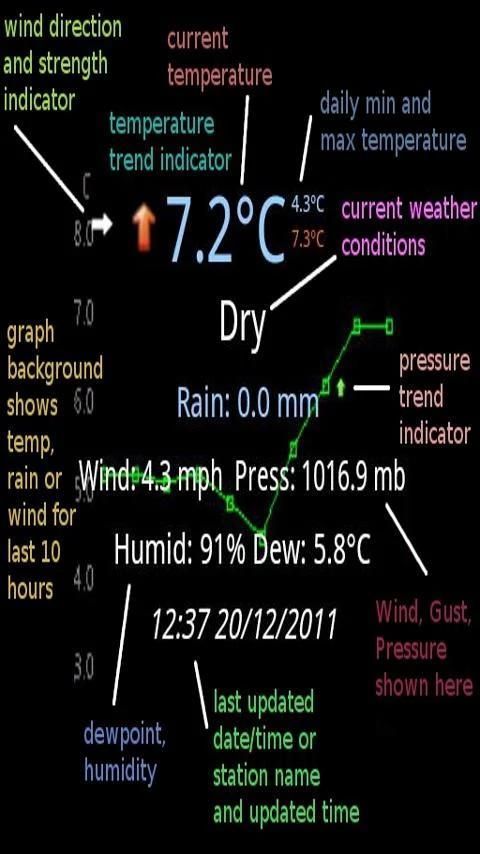 The widget background can be changed to either black, transparent, semi transparent, a cloud or a dynamic 10 hour graph of temperature, rain, pressure or wind.