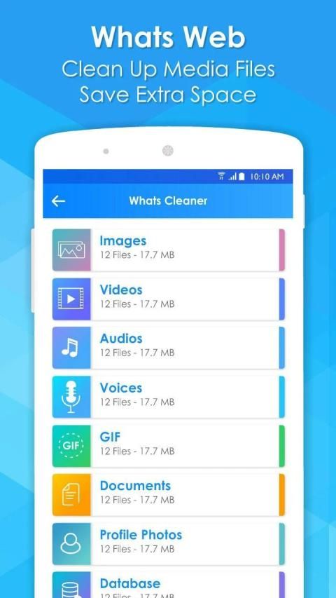 यह उपकरण आपके डिवाइस पर स्थान बचाने के लिए व्हाट्सएप के माध्यम से भेजे और प्राप्त फ़ाइलों को खोजने और हटाने में सक्षम बनाता है। आप सभी मीडिया फ़ाइलों को आसानी से साफ कर सकते हैं। आप बस एक क्लिक के साथ अपने चित्र, वीडियो, ऑडियो फ़ाइलें, आवाज, दस्तावेज, डेटाबेस आदि को साफ कर सकते हैं।