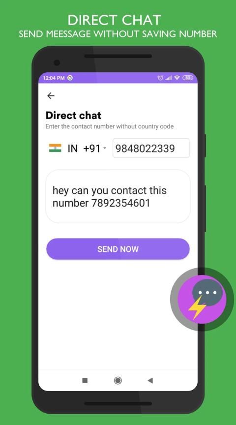 बिना सेविंग नंबर के डायरेक्ट मैसेज भेजकर नया व्हाट्सएप कन्वर्सेशन शुरू करें। वा डायरेक्ट चैट ऐप इसे आसान बनाता है, बस आपको मैसेज टाइप करना है और कॉल लॉग और उसके नंबर से नंबर चुनना है।