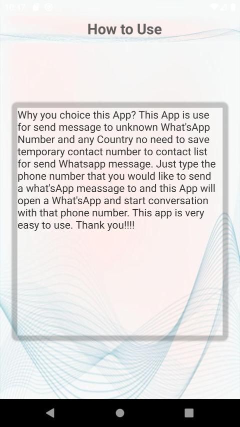 वर्तमान डिवाइस में व्हाट्सएप एक आवश्यक उपकरण है। यह एक सरल लेकिन बहुत ही शक्तिशाली एप्लिकेशन है जिसका मुख्य कार्य व्हाट्सएप पर मैसेज भेजना है अपने फोन पर संपर्क को पंजीकृत किए बिना, सीधे उस नंबर को लिखना जिस पर आप संदेश भेजना चाहते हैं।