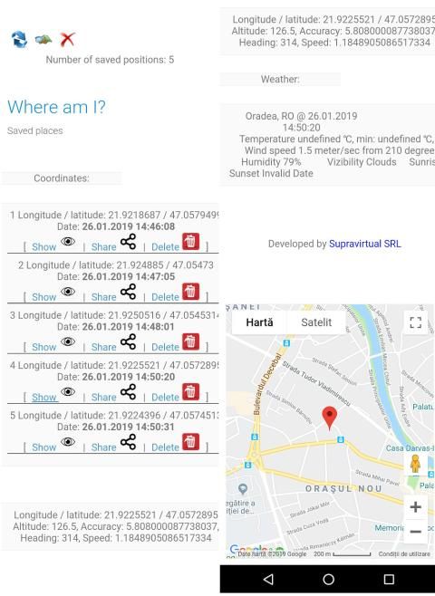 आवेदन जीपीएस निर्देशांक और आप कहाँ हैं के लिए मौसम की स्थिति दिखाते हैं। आप उन्हें दुनिया के साथ साझा कर सकते हैं (ऑनलाइन या एसएमएस) या आप बाद में उन्हें सहेज और साझा कर सकते हैं। आप अपने मार्ग को रिकॉर्ड कर सकते हैं और इसे अन्य एप्लिकेशन या साइटों के साथ उपयोग करने के लिए GPX प्रारूप में निर्यात कर सकते हैं।