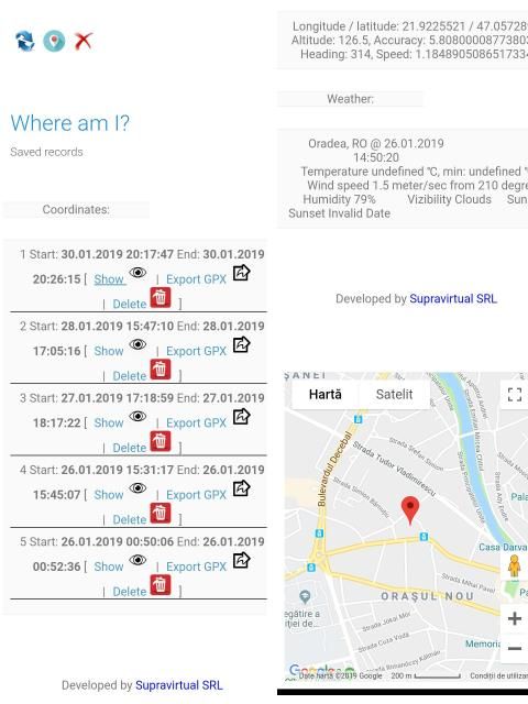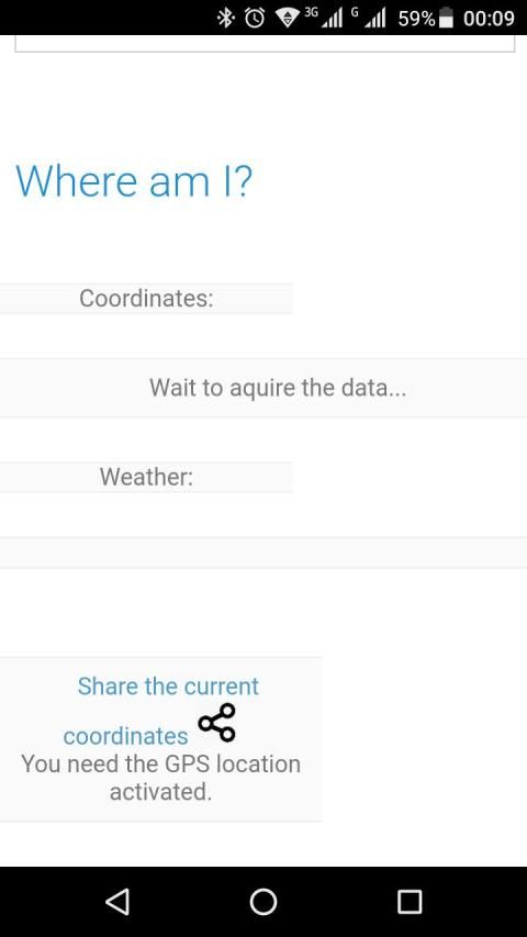 The application show the GPS coordinates and the weather conditions for where you are. You can share them with the world (online or sms) or you can save and share them later. You can record your route and export it into GPX format to be used with other apps or sites.