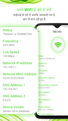 ☑ वाईफाई राउटर जानकारी: अपने वाईफाई कनेक्शन के बारे में अधिक विस्तृत जानकारी प्राप्त करें जैसे स्टेटस, फ्रीक्वेंसी, लिंक स्पीड, एसएसआईडी, बीएसएसआईडी, वेंडर, आईपी एड्रेस, मैक एड्रेस और आदि।