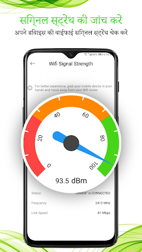 ☑ वाईफाई सिग्नल स्ट्रेंथ एनालाइजर: यह आपके डिवाइस की वाईफाई सिग्नल स्ट्रेंथ को मापने और उसका विश्लेषण करने में आपकी मदद करता है ताकि आप अपने खराब इंटरनेट कनेक्शन के पीछे के कारण को आसानी से पहचान सकें।