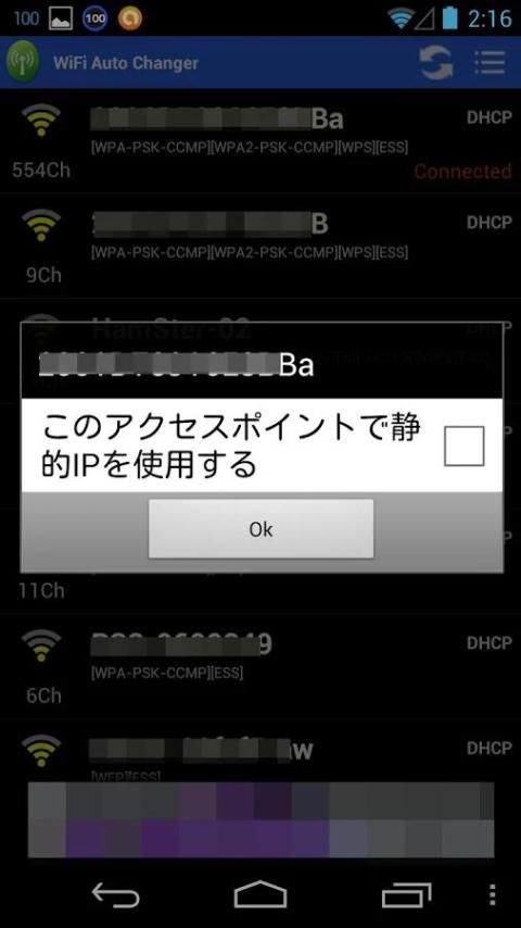 「スキャン開始」ボタンを押すと、近くのアクセスポイント(以下AP)が一覧に表示されます。切り替えたい対象のAPを長押しするとダイアログが表示されますので、静的IPを使用する場合はチェックをつけてください。