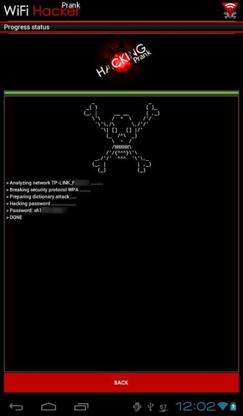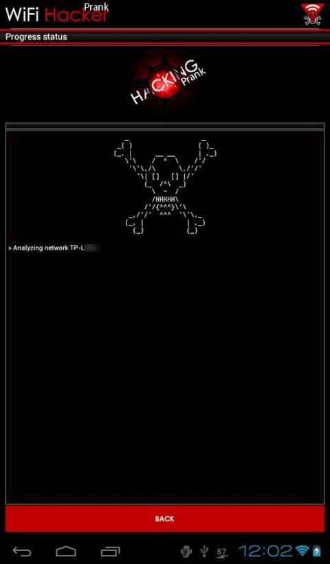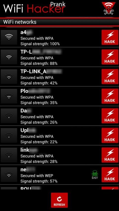 वाईफ़ाई हैकर शरारत उपलब्ध वाईफाई नेटवर्क के लिए स्कैन करता है और उनके बारे में सुरक्षा जानकारी प्रदर्शित करता है. वाईफ़ाई हैकर संभावित कमजोर सुरक्षा के साथ routers highligts. आप रेंज में एक वाईफाई नेटवर्क पर नल जब हैकिंग शुरू होता है. एक डरावना लग ब्लैक बॉक्स प्रकट होता है और नेटवर्क सुरक्षा को तोड़ने का दिखावा.