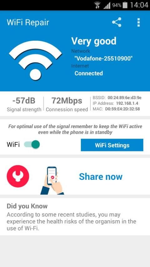 वाईफाई मरम्मत अपने स्मार्टफोन की और सिर्फ एक क्लिक से अपने कनेक्शन के अनुकूलन के वाई-फाई कनेक्शन में मुद्दों का पता लगाने में सक्षम दुनिया में केवल app है।