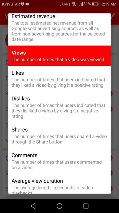 - अनुमानित मिनट यूट्यूब चैनल वीडियो (estimatedMinutesWatched) के देखे;