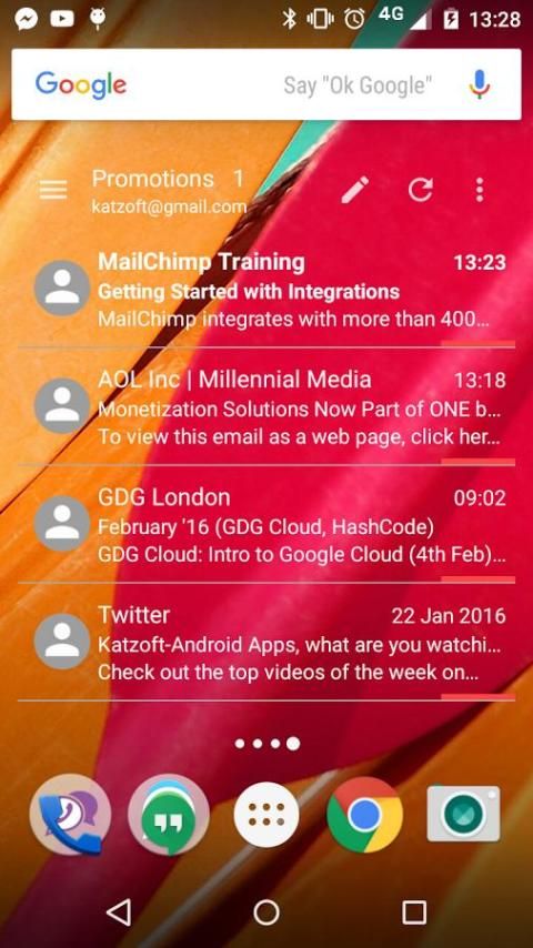 - अलग लेबल का समर्थन करता है (उदाहरण के प्रधान इनबॉक्स, तारांकित और कस्टम लेबल) कई खातों से, यहां तक कि एक ही विजेट पर (एकीकृत इनबॉक्स)