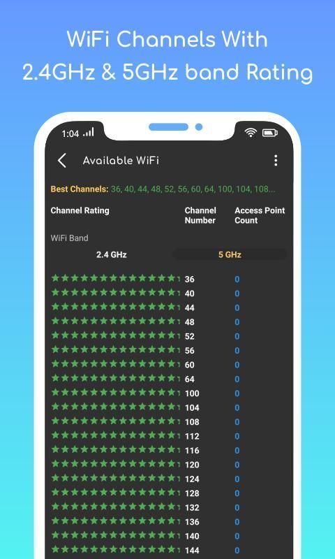 - Wifi channel rating : Get list of best channel for 2.4GHz and 5GHz.