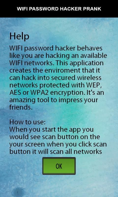 वाईफाई पासवर्ड हैकर आप एक उपलब्ध वाईफाई नेटवर्क हैकिंग कर रहे हैं की तरह बर्ताव करता है कि एक शरारत app है। इस शरारत app यह WEP, एईएस या WPA2 एन्क्रिप्शन के साथ सुरक्षित सुरक्षित वायरलेस नेटवर्क को हैक कर सकते हैं कि वातावरण बनाता है। यह असली में पासवर्ड हैक नहीं है। लेकिन यह अपने मित्रों को प्रभावित करने के लिए एक अद्भुत उपकरण है और उन्हें मूर्ख सकता है। इस एप्लिकेशन को आप उनके सामने एक पेशेवर हैकर कर देगा। यह आप अपने दोस्तों के साथ खेल सकते हैं एक बहुत ही अद्भुत शरारत है।