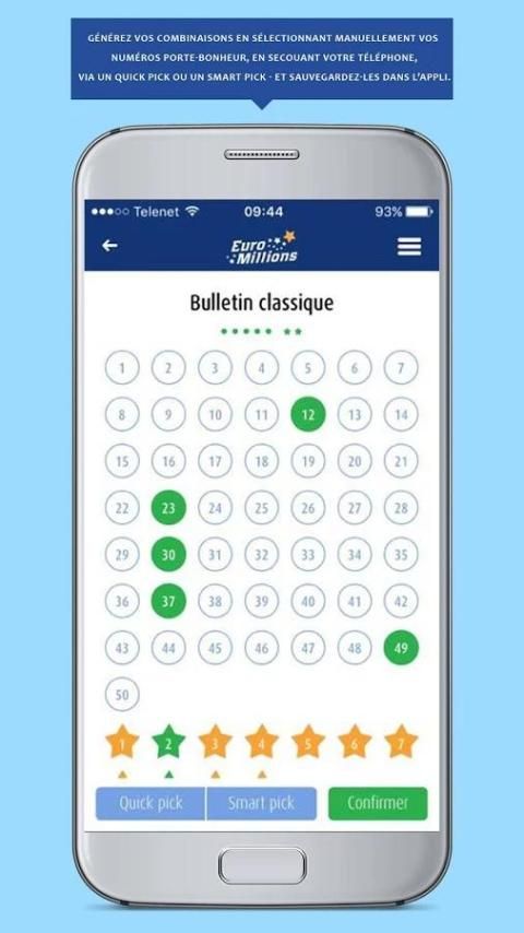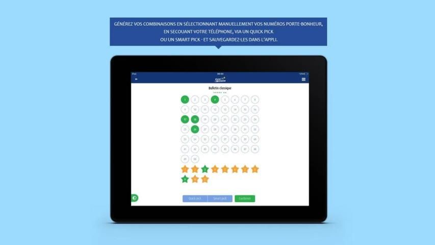 स्क्रीन पर संख्या के अपने खुद के संयोजन लिखें, अपने स्मार्टफोन या मिलाते हुए अपने टिकट का एक सरल स्कैन के माध्यम से। आपका स्मार्टफोन भी आप के लिए एक संयोजन (त्वरित लेने) चुन सकते हैं या अपने पसंदीदा रंग या अपने नाम (स्मार्ट लेने) पर आधारित एक मिश्रण बनाने के लिए आप की पेशकश कर सकते हैं।