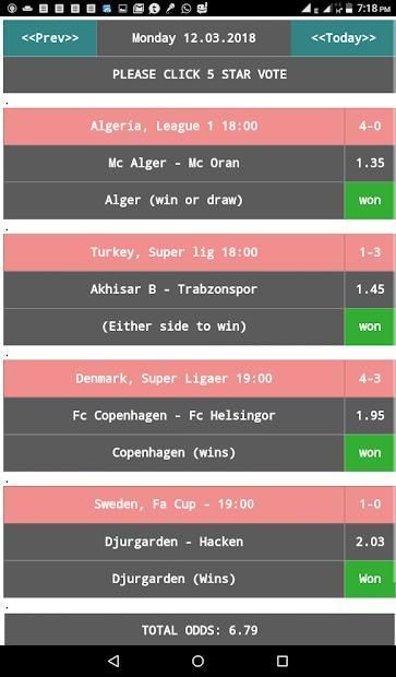 This app provides you with well analyze and seleted tips based on mathematical and statistical methodologies. The games ranges from "win or draw, home to win or draw (1X), away to win or draw( X2) and either side to win (12)".