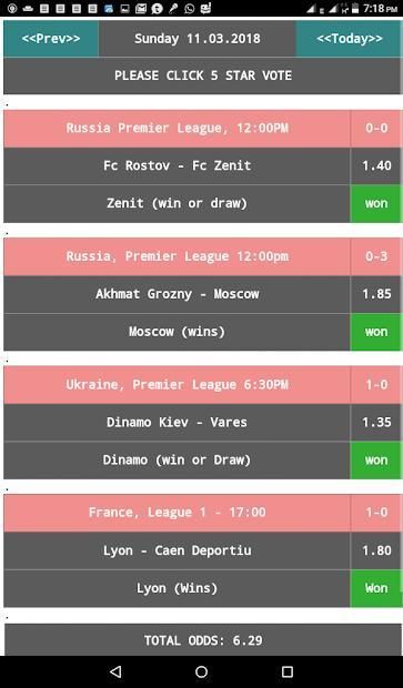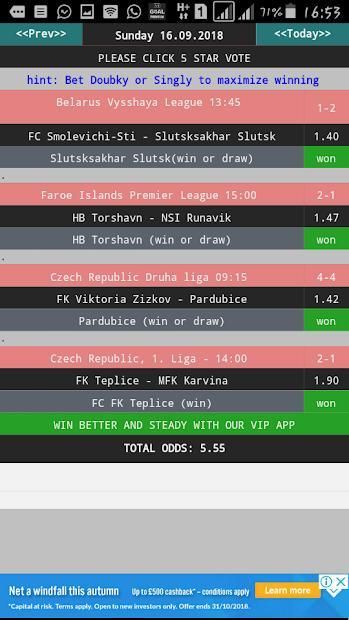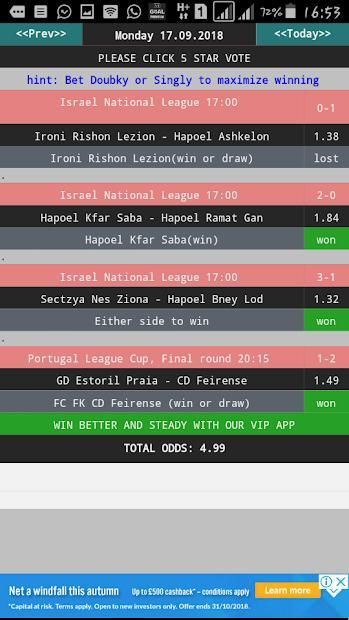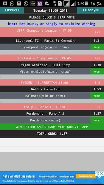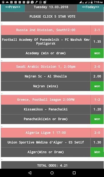 साथ अच्छी तरह से विश्लेषण और seleted गणितीय और सांख्यिकीय तरीके के आधार पर सुझाव दिए गए इस एप्लिकेशन को प्रदान करता है। खेल "जीत या आकर्षित, (1X) जीत या आकर्षित करने के लिए घर, दूर जीत या आकर्षित (X2) और दोनों ओर जीतने के लिए (12) करने के लिए" से लेकर।