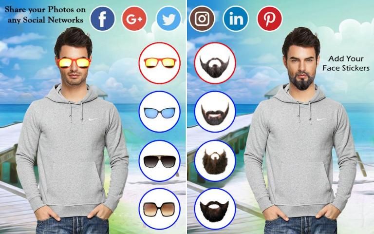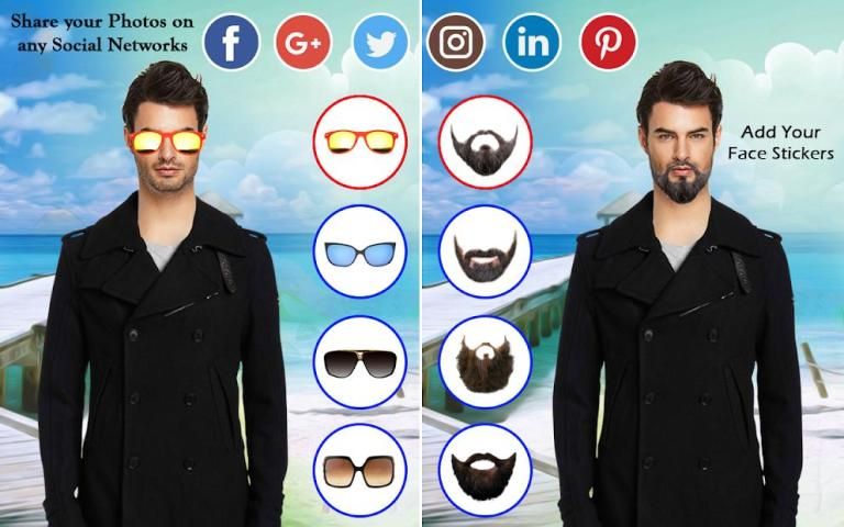 Hundreds of stickers are available in this Men Winter Jacket Photo Editor 2018 The categories are Miss you, Horse, Girls, animals, Balloon, Cakes, candy, carnival, emoji, smiley, flower crown,eyes, Clown faces,mouth, Comic, Dog & cat,love,beard, men hairstyle,mustache,tattoo, photo booth, sunglass,women hair style,women tattoo andwomen hat stickers.