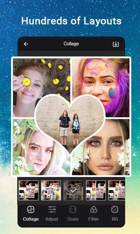 You can pick layout you want it to be, edit collage with filter, sticker, text ,background and much more.