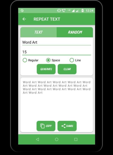 > Repeat Text - Enter text and repetition number to generate text for multiple times. Here you can add space and line for the generated text. You can even generate random text by specifying a character length.