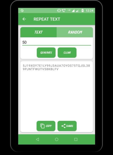 > पाठ दोहराएं - कई बार पाठ उत्पन्न करने के लिए पाठ और पुनरावृत्ति नंबर दर्ज करें। यहां आप जनरेट किए गए टेक्स्ट के लिए स्पेस और लाइन जोड़ सकते हैं। तुम भी एक चरित्र की लंबाई निर्दिष्ट करके यादृच्छिक पाठ उत्पन्न कर सकते हैं।