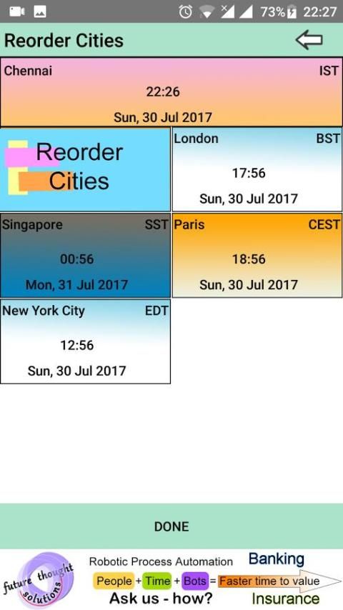 विश्व समय नियोजक में, समय घर शहर सहित हर शहर के लिए बदला जा सकता है। समय कन्वर्ट तुरन्त। एक शहर में कोई परिवर्तन गतिशील रूप से अन्य सभी तुरन्त शहरों के लिए बदल जाता है। हम 22000+ शहरों के एक डेटाबेस है।