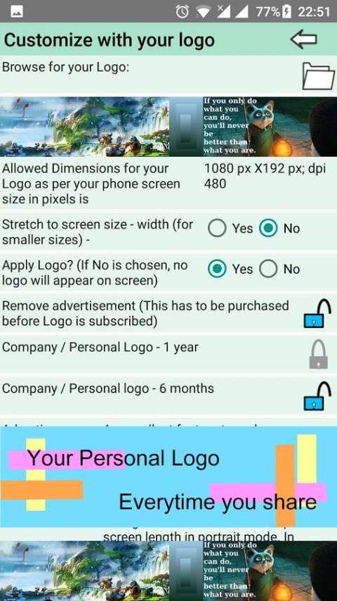 मेनू से अनुकूलन लोगो, एक प्रतीक चिह्न आपके ग्राहकों हर बार जब आप उन लोगों के साथ समय का हिस्सा अपने उत्पादों के बारे में पता कर देगा। अपने फोन से आप द्वारा लोड एक व्यक्तिगत छवि भी व्यक्ति जो साझा किया गया है द्वारा प्राप्त हो जाएगा। अपनी कंपनी के उत्पादों advertize या अपनी रणनीति को प्रकाशित करें। एक व्यक्ति के रूप में, अपने मित्रों या सहकर्मियों के साथ, अपने विचारों करें।