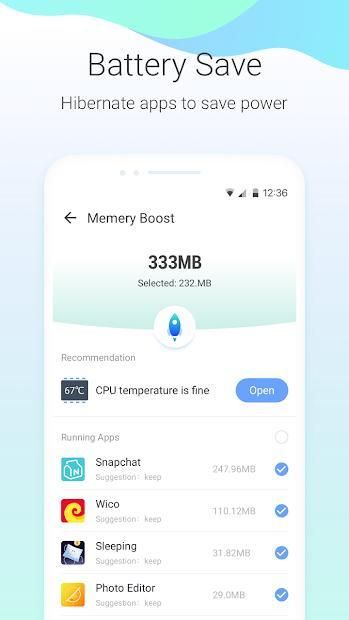 वाह बूस्टर सबसे अच्छा मुफ्त सफाई ऐप्स में से एक है। आप स्टोरेज की निगरानी और अपने फोन मेमोरी को साफ करने में सक्षम हैं। हमारे पास सीपीयू कूलर और अधिसूचना क्लीनर भी है।