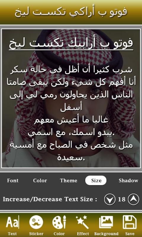 आप तस्वीरें पर अरबी में पाठ की कई पंक्तियों लिख सकते हैं। बस फोटो एप्लिकेशन पर इस अरबी पाठ डाउनलोड करने और किसी भी सामाजिक मीडिया क्षुधा के माध्यम से आसानी से अपने फ़ोटो साझा करें।
