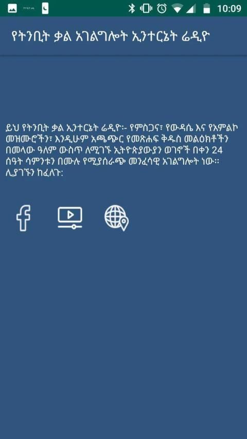 यह एक आध्यात्मिक सेवा है जो "सुसमाचार के वचन के सुसमाचार" द्वारा प्रदान की गई है, रेडियो सेवा देने वाले धन्यवाद, स्तुति और पूजा के गीत और लघु बाइबिल संदेश दुनिया भर में 24 घंटे इथियोपिया के लोगों को प्रभु की बहाली के लिए हमारे श्रोताओं को तैयार करने के लिए।