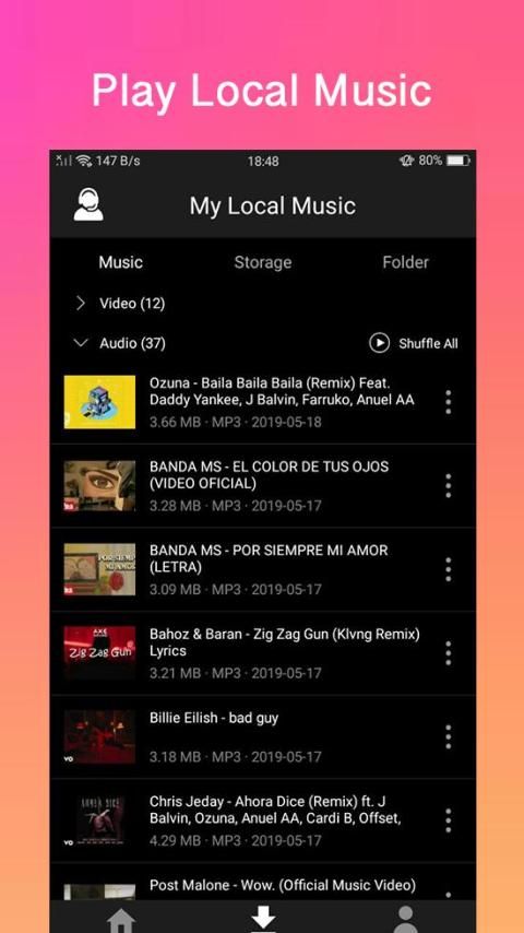 Full featured in app media player: repeat one/all, shuffle.