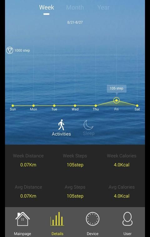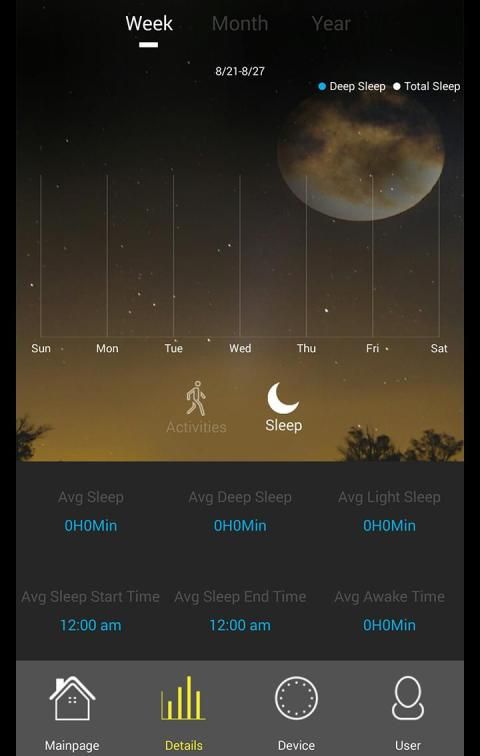 * गतिविधि है, जो एक सप्ताह, महीने और साल के लिए कदमों की गणना इतिहास से पता चलता विस्तृत ग्राफ। नींद की निगरानी के लिए एक ही प्रदर्शित करता है; यह कुल सोने का, गहरी नींद और प्रकाश नींद के घंटे को दर्शाता है।