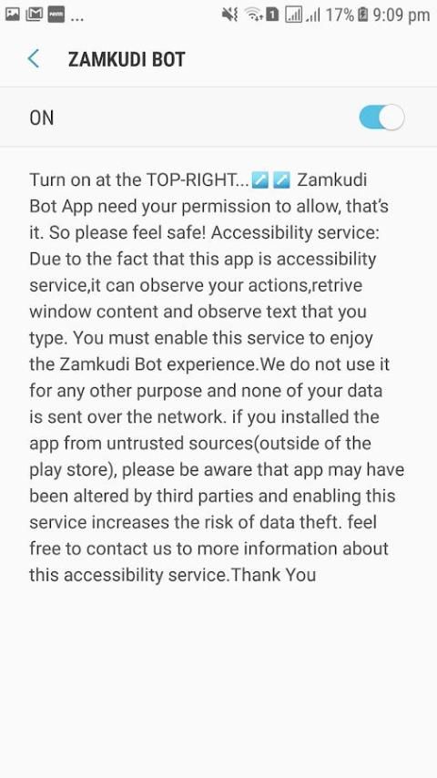 खुलापन लाभ चालू होना चाहिए Zamkudi बॉट काम करने के लिए। आवेदन ही उपाय Zamkudi बॉट 2 एमबी तहत किया जा रहा के साथ सब बात अनुप्रयोगों चलाता है और सभी अन्य ललाट क्षेत्र और नींव अनुप्रयोगों या प्रशासन का नजारा दिखता है।