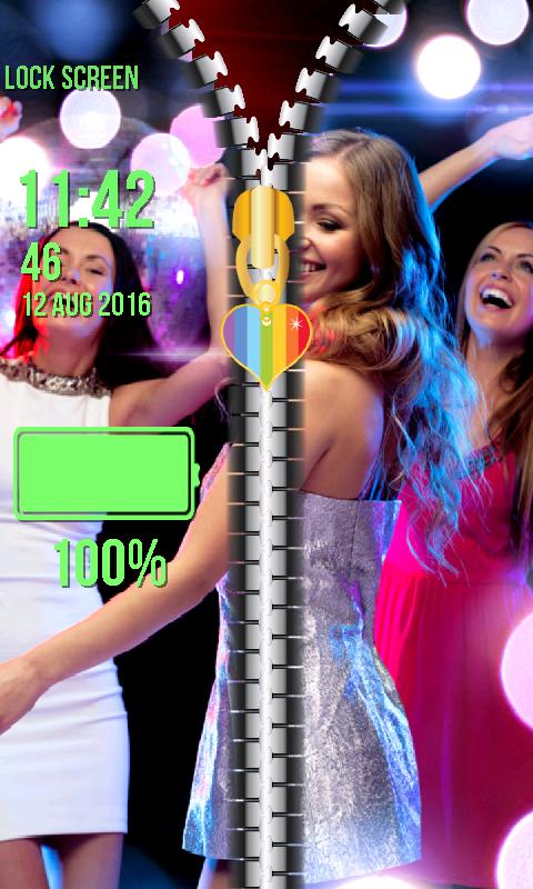 Unzip your photo and a beautiful lady in little black dress will show up. She is in a disco club and is swaying in the rhythm of the music. The popular Zipper Lock Screen Dancer will remind you that it is high time to go out and have some fun. If you prefer there is an option to find in your phone gallery the photos that you would like to use as cool foregrounds or backgrounds. As well, you will be able to select the color and font for time and date that will be displayed on your screen. Drag the hook to unlock your top zipper locker and be inspired to enjoy life and go dancing. Even if you are an amateur, that doesn’t matter because there is no greater fun than following the beat. Install the top Zipper Lock Screen Dancer and you will be taken into the incredible world of endless joy.
